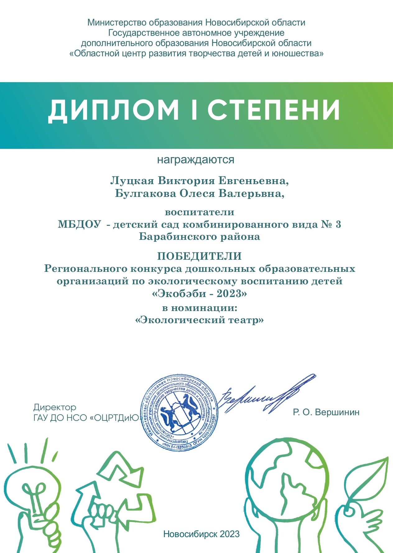 Региональный конкурс дошкольных образовательных организаций по экологическому воспитанию детей "Экобеби - 2023" в номинации "Экологический театр", диплом 1 степени, 2023 год